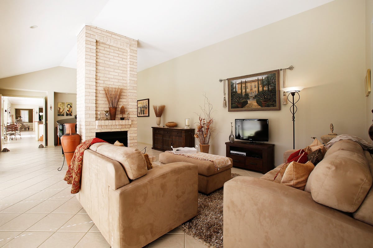 The formal lounge is centred around the fireplace.