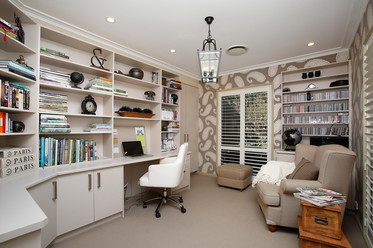 The home has beautiful custom built cabinetry in the family room, dining, study and media room.
