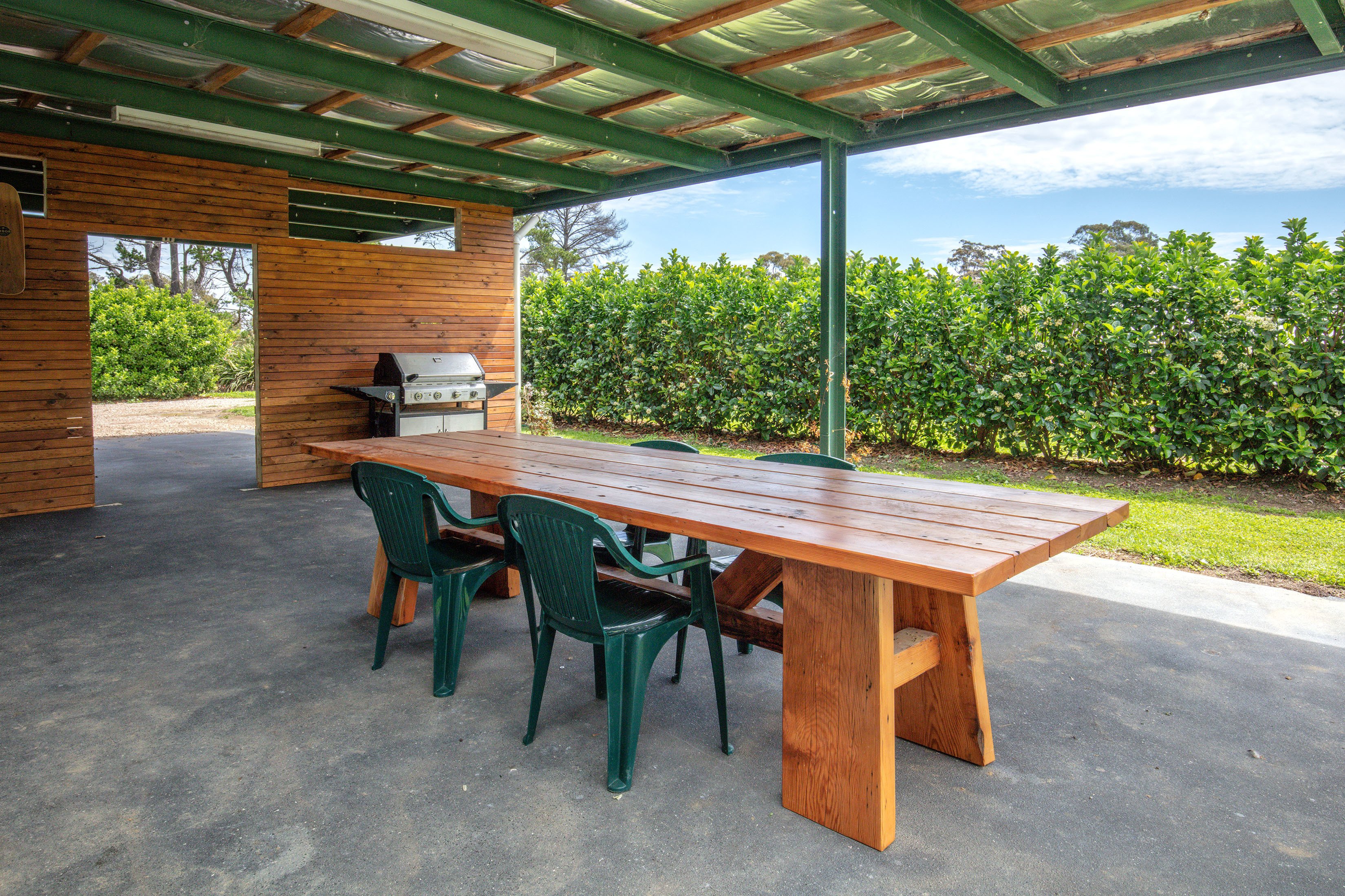 The shed has been fitted out with three bedrooms, main with ensuite, living, kitchen and an outside undercover entertaining area.